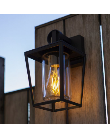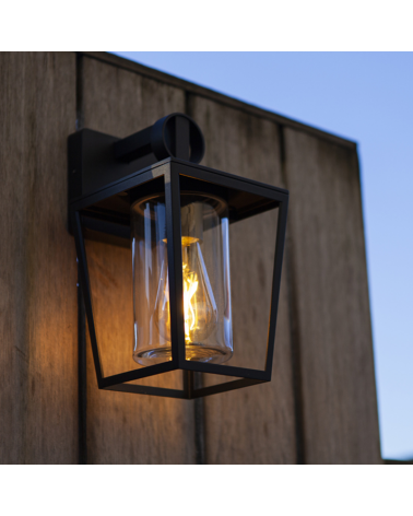 The outdoor wall light with a matt black finish, designed to provide effective lighting in outdoor spaces. With a height of 28.8cm, it is made of high-quality aluminum to guarantee its durability and resistance to adverse weather conditions and a transparent glass screen.