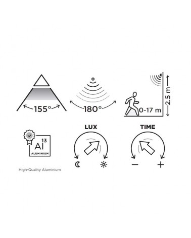 This wall light has a built-in motion sensor, which ensures that the light is automatically activated when movement is detected. Thanks to its 180° detection angle and a detection distance of up to 17 meters, you will have reliable and convenient lighting.