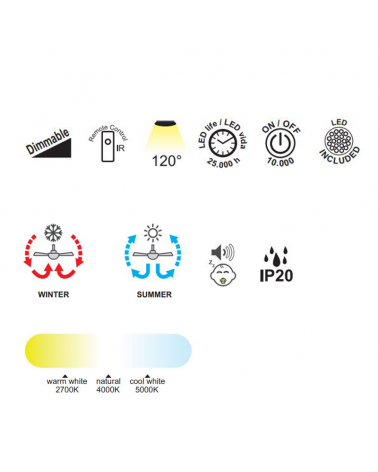 The ceiling fan is a modern and functional piece, perfect for refreshing and decorating any room in your home. With a diameter of Ø52cm, a 45W DC Led ceiling motor and a ventilation power of 30W, ensuring adequate lighting and ventilation for the space in which it is located.