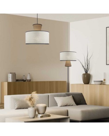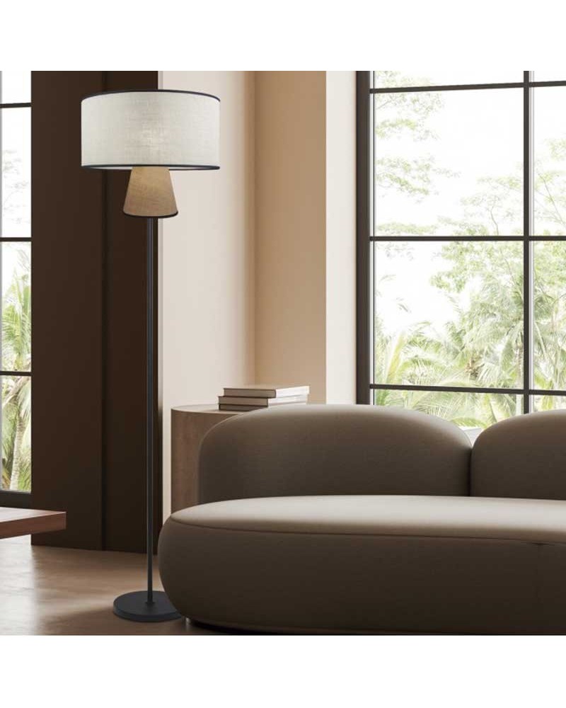 Elegant floor lamp with a height of 168cm. Its black finish metal construction gives a feeling of sophistication and durability. The fabric lampshade with a two-tone aesthetic that captures the eye with its originality, harmoniously combines beige and tan tones with a black ribbon, creating a subtle but striking contrast that adds warmth and style to any room.