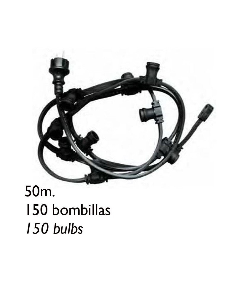 50 meter string light with 150 sockets for E27 screw bulbs. Very long: it measures 50 meters, ideal for lighting events such as weddings, parties, inaugurations, terraces, restaurants, hotels,
