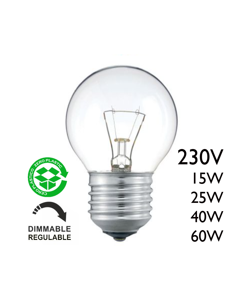 round clear glass incandescent lamp with 230V voltage, E27 socket. Available in different powers.