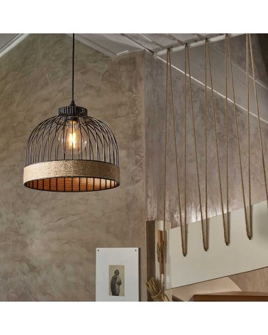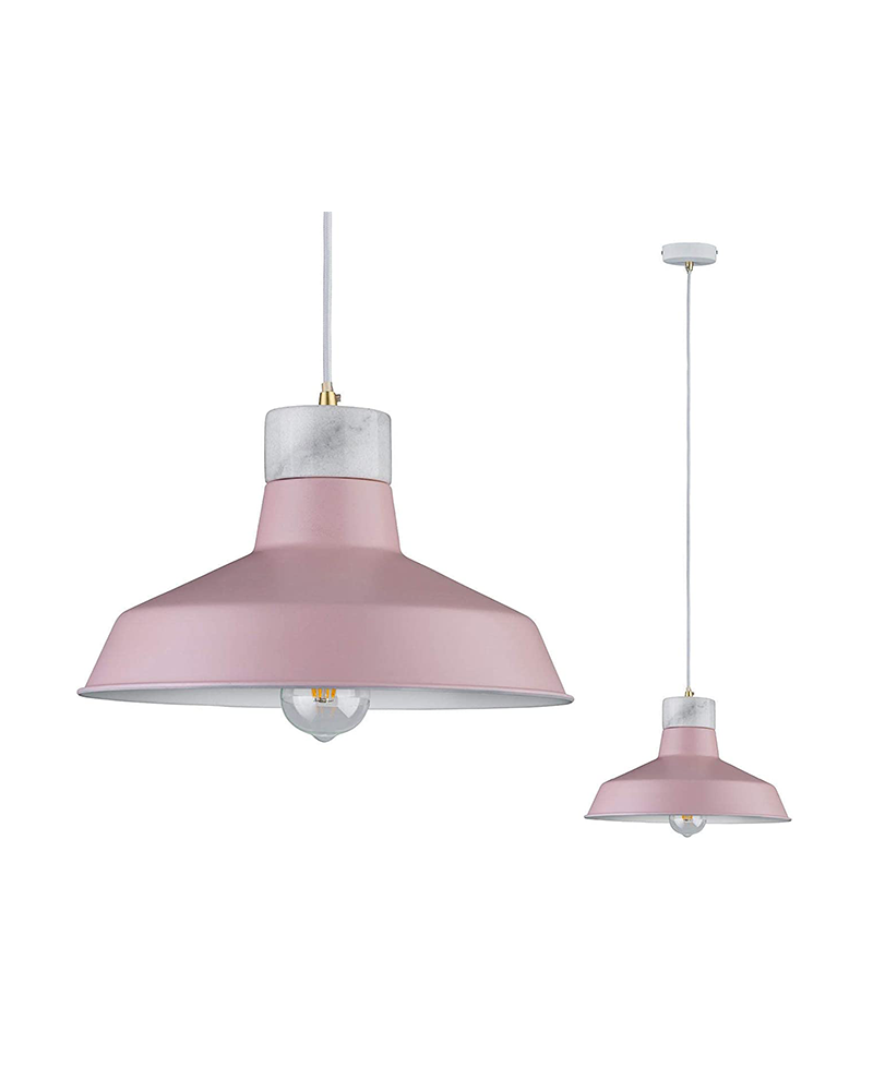 Ceiling lamp in a pink finish made of metal with a marble detail in a Nordic or industrial style, cable with a fabric sheath.