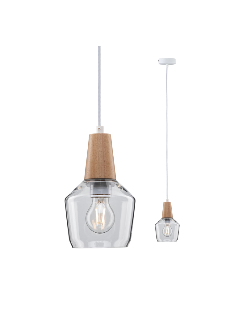 Scandinavian style lamp, glass attached to elegant wood, simple and perfect in any space. (FSC certified product, with wood from responsibly managed forests) . Cable with fabric cover, it is perfect with LED filament bulbs.