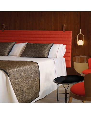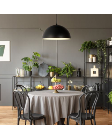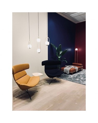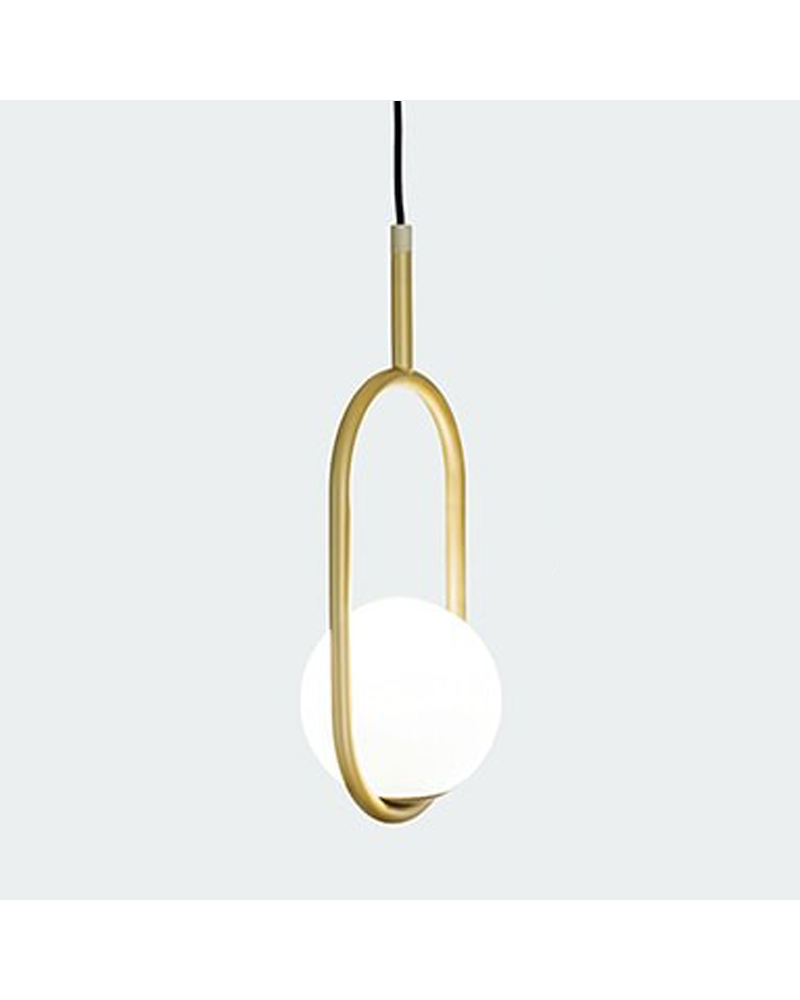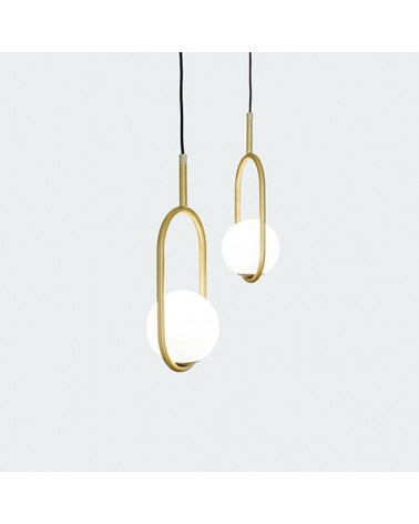 Design ceiling lamp of 39 cm, made of metal formed by an opal glass sphere. As a complement there is a floor and table lamp. It is manufactured in different colors in satin brass or matt black. Marked style and trend.