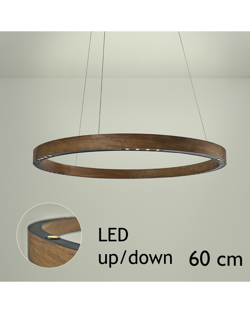 Beautiful designer ceiling lamp with LED projector modules, with a 60 cm aluminum ring shape, with a ceiling rose for lower ceilings. With indirect lighting, called up / down. In the upper part 3 LEDs of 4.5W 1638lm and in the lower part 3 LEDs of 18W 7879lm. Light intensity regulation. It is perfect to illuminate modern and minimalist spaces, aesthetically very original.