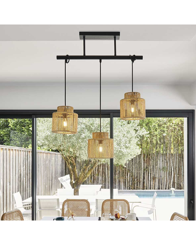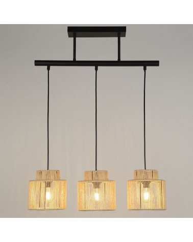 Pendant lamp with a rectangular metal base provided with 3 screens designed using braided paper creating original lighting, natural finish. The screens are designed to be adjustable in height independently, making it more decorative. For any room such as bedrooms, living rooms, restaurants, dining rooms... It provides a comfortable and original environment. Made with ecological materials and without impact on the environment. Bulb not included.