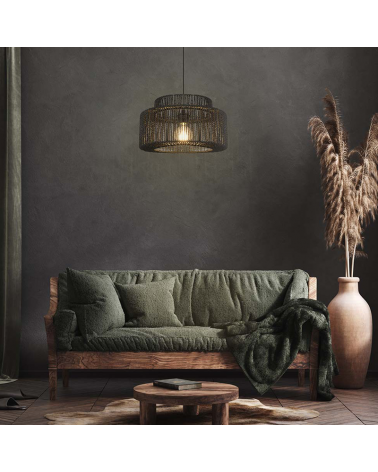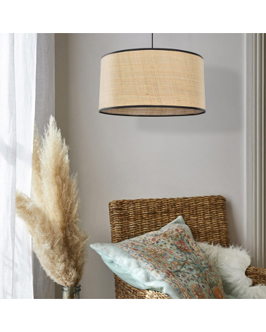 Circular lampshade pendant lamp made of natural raffia with two strips at the top and another at the bottom in brown, making it more decorative. Create a cozy and warm effect. Ideal for bedrooms and dining rooms. Made in Europe. Bulb not included.