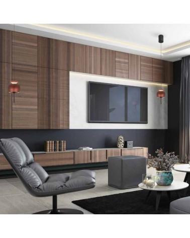 With a diameter of 96cm, this lamp becomes the center of attention in any space, capturing eyes and emitting a captivating light. Made of high-quality aluminum, its structure ensures exceptional durability and a modern aesthetic that adapts perfectly to various environments. Available in three finishes orange, copper or chrome/black.