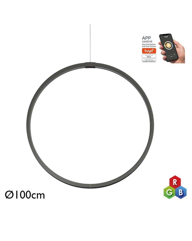 Made of aluminum available in white or black finishes with a diameter of 100cm. It is perfect for illuminating contemporary and minimalist spaces. With the Tuya app, for smart control, you can adjust brightness, change colors and schedule schedules for your lamp, all from the convenience of your mobile device.