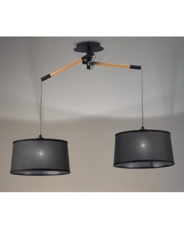 Ceiling lamp with 2 black fabric shades adjustable height of wood 2xE27
