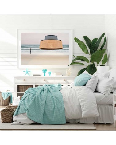 Bohemian design hanging ceiling lamp made with raffia and turquoise and finished in a natural tone. Made using ecological materials that have no impact on the environment. Perfect for decorating bedrooms and living or dining areas. Bulb not provided.