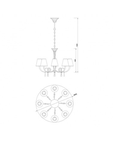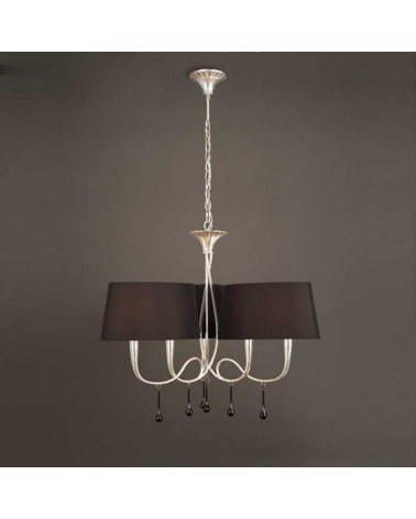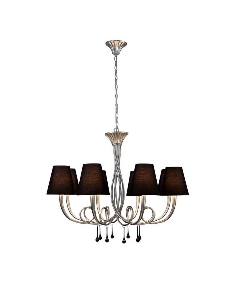 95cm diameter ceiling lamp. It is composed of 8 fabric lampshades in a black finish and a silver base. This sophisticated lamp includes 8 E14 sockets, designed for bulbs with up to 20W maximum power each. So you can choose the color of the light you want according to your preferences (Bulbs not included).