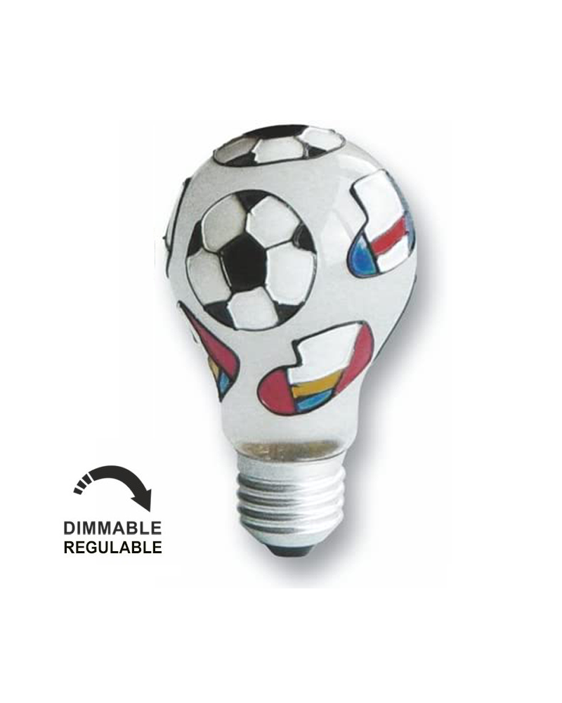 Standard incandescent light bulb for children with a soccer BALL motif, 25W, E27 socket. Shape: standard decorated with a balloon motif. Light Type: Incandescent OFFER LIMITED TO END OF STOCK.