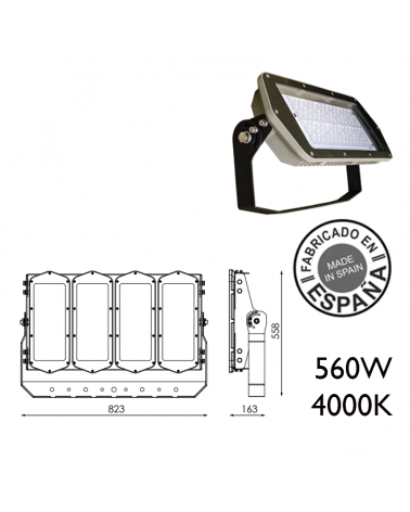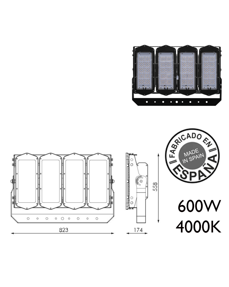 600W, 4000K industrial projector and upon request in warm 3000K light or 5000K IP66 high luminosity white daylight. With an intensity of 1000mA. Made of iap aluminum and transparent polycarbonate diffuser. It has a long life with more than 100,000 hours. Made with high quality materials designed in Spain. Dimmable using the Dali system. It has HCB, TESS, OVERSTORM and SYSTEMSHIELD technology.