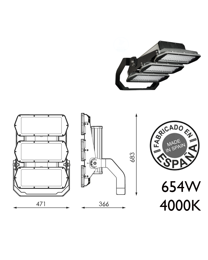 Industrial projector of 654W, 4000K and on request in warm light 3000K or white light 5000K IP66 of high luminosity. With an intensity of 1400mA. Made of iap aluminum and transparent polycarbonate diffuser. It has a long life with more than 200,000 hours. Made with high quality materials designed in Spain. Dimmable using the Dali system. It has HCB, TESS, OVERSTORM and SYSTEMSHIELD technology.