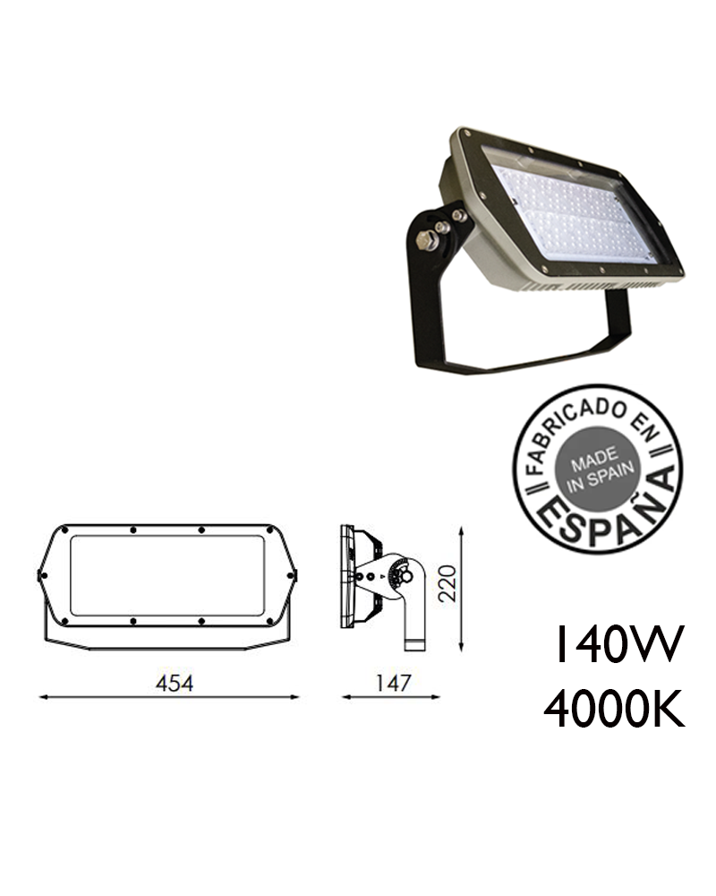 Industrial projector of 140W, 4000K and on request in warm light 3000K or white light 5000K IP66 of high luminosity. With an intensity of 1000mA. Made of iap aluminum and transparent polycarbonate diffuser. It has a long life with more than 100,000 hours. Made with high quality materials designed in Spain. Dimmable using the Dali system. It has HCB, TESS, OVERSTORM and SYSTEMSHIELD technology. These luminaires can be combined (installed together) being necessary to acquire the convenient BOX, remote installation system.