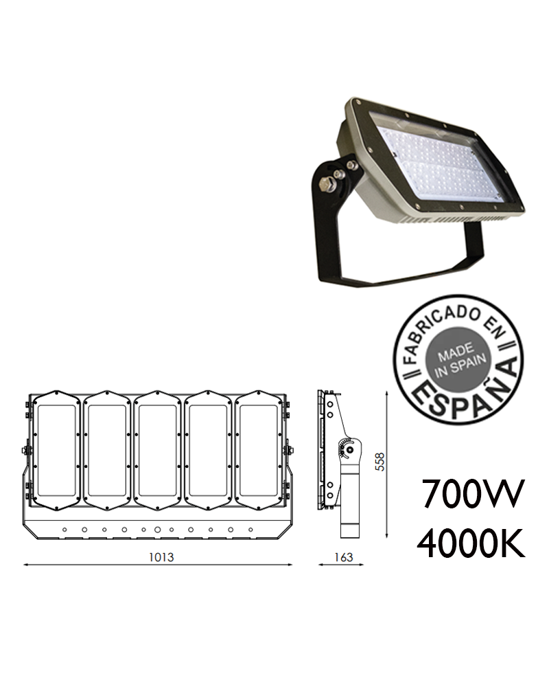 Industrial projector of 700W, 4000K and on request in warm light 3000K or white light 5000K IP66 of high luminosity. With an intensity of 1000mA. Made of iap aluminum and transparent polycarbonate diffuser. It has a long life with more than 100,000 hours. Made with high quality materials designed in Spain. Dimmable using the Dali system. It has HCB, TESS, OVERSTORM and SYSTEMSHIELD technology. These luminaires can be combined (installed together) being necessary to acquire the convenient BOX, remote installation system.