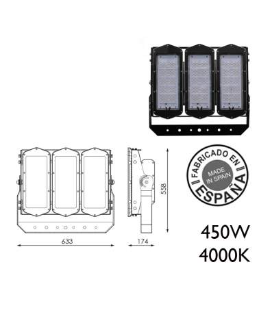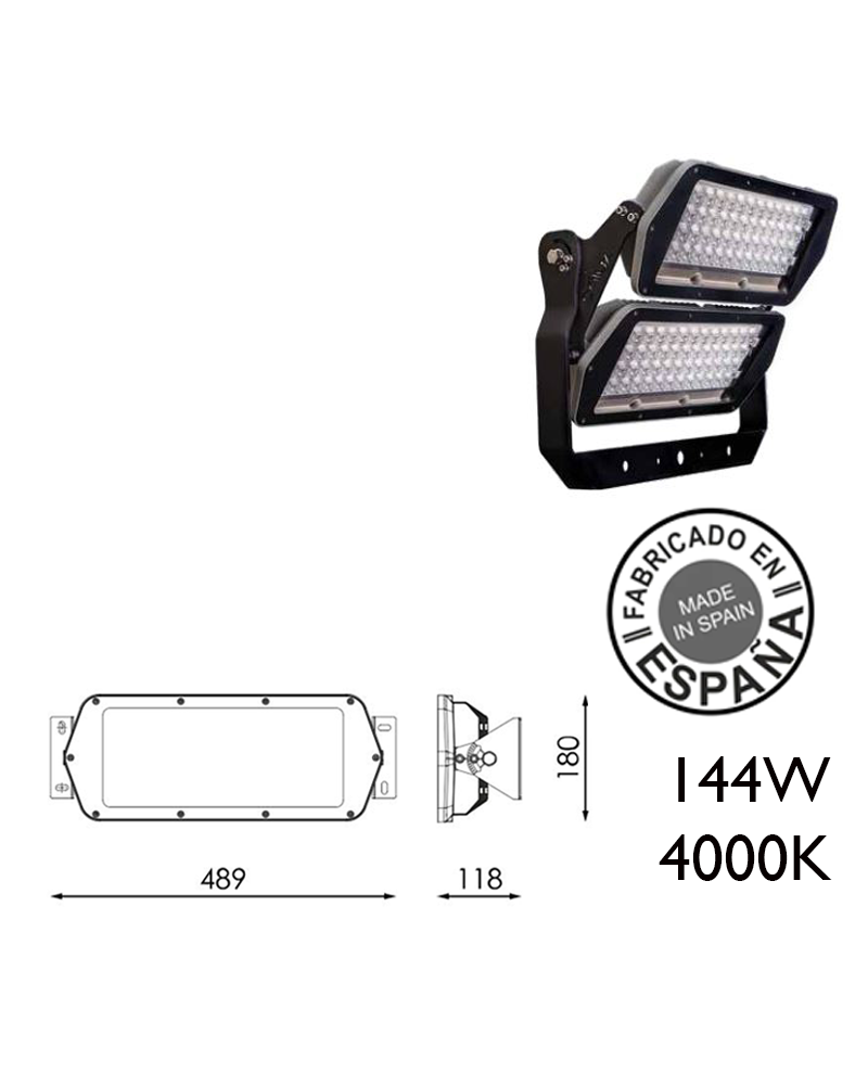 144W, 4000K industrial projector and upon request in 3000K warm light, 5000K day white light, red light, green light and blue light. High luminosity IP66. With an intensity of 1000mA. Made of iap aluminum and transparent polycarbonate diffuser. It has a long life with more than 200,000 hours. Made with high quality materials designed in Spain. Dimmable using the Dali system. It has HCB, TESS, OVERSTORM and SYSTEMSHIELD technology. These luminaires can be combined (installed together) being necessary to acquire the convenient BOX, remote installation system.