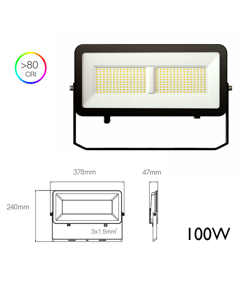 100W industrial projector, temperature available in 3000K, 4000K and 5000K. Protection index IP65. Very high brightness. Made of aluminum and finished in matte black. CRI>80. It has a long life of 50,000 hours. With measures of 37.8x24x4.7cm. Ideal for sports facilities or facade lighting.