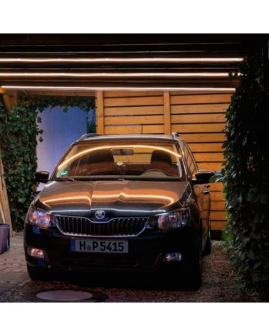 The outdoor LED strip in warm white, with an extension of 5 meters, provides uniform decorative lighting throughout the home. Generates an adaptable line of light without visible LED points. This complete, plug-and-play kit is perfect for illuminating areas such as the garage, roof eaves or terrace. The strip emits a continuous strip of light thanks to its large number of LEDs and its durable silicone cover, which protects it against dust and splashes of water.