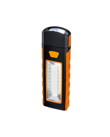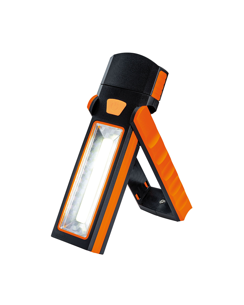 LED flashlight with hanging ring, easel and LED magnet 2.7w 150lumens in orange and black. Requires 4 AAA batteries not included