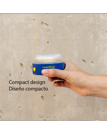 Safety Light Goodyear, emergency light for cars v16. It has been thought and designed with the highest quality standards to save lives on the road. Manufactured under the most demanding IP54 approval criteria, it can be used under the most adverse weather conditions, such as rain, dust and wind.
