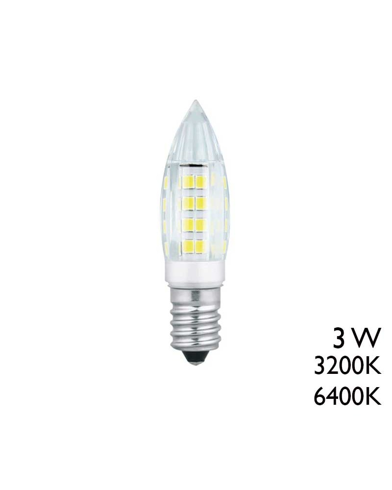 lluminate your spaces with this E14 candle bulb, which creates a cozy atmosphere anywhere. With an estimated lifespan of 25,000 hours, you will enjoy its brightness for a long time without worries. Its power of 3 W provides a luminosity of 250/280 lumens, equivalent to a traditional 28 W bulb, making it an efficient choice. Mini LED Candle Bulb E14 3W 250lm available in cool and warm light It operates at a voltage of 220-240 V and has a beam angle of 300°, ideal for wide light diffusion.