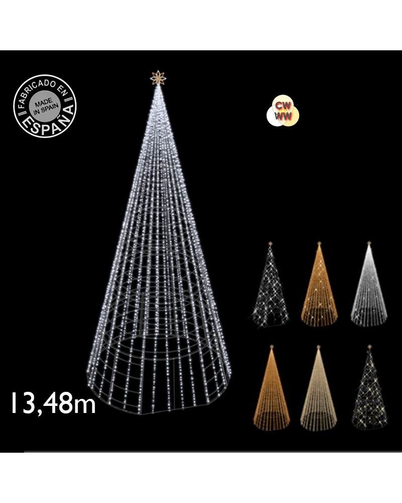 Elegant LED cone 13.48 meters high with a star illuminated by cool and warm white LEDs. Structure in aluminum alloy 6063 and temper T5. Suitable for outdoor use IP65. Being LED technology, it only consumes 780W.