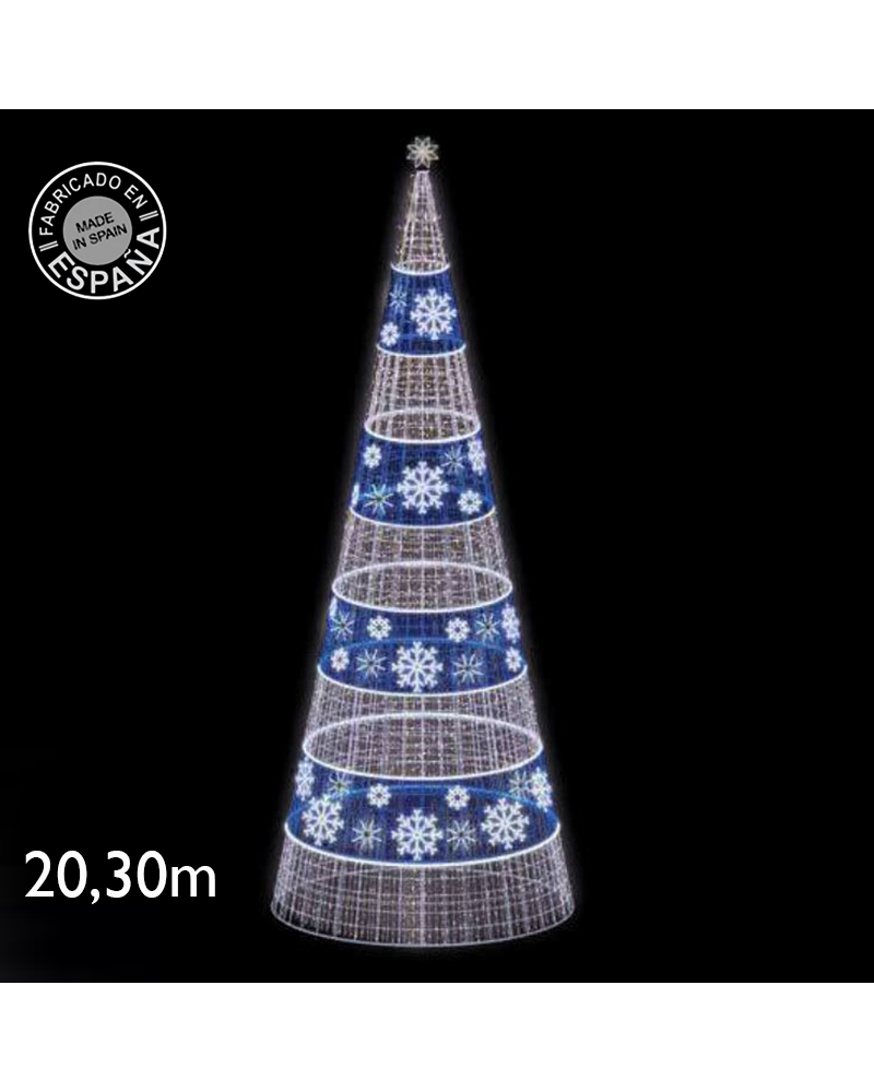 Elegant LED cone 20.30 meters high with a star, adorned with snowflakes. Illuminated by leds with cool light and blue light. Structure in aluminum alloy 6063 and temper T5. Suitable for outdoor use IP65. Being LED technology, it only consumes 3987W.