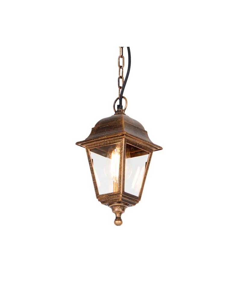 Hanging outdoor ceiling lamp made of cast aluminum and old gold finish glass. This outdoor hanging lamp with a classic and rustic design that never goes out of style is ideal for adding luminosity to poorly lit outdoor areas, such as gardens or terraces.
