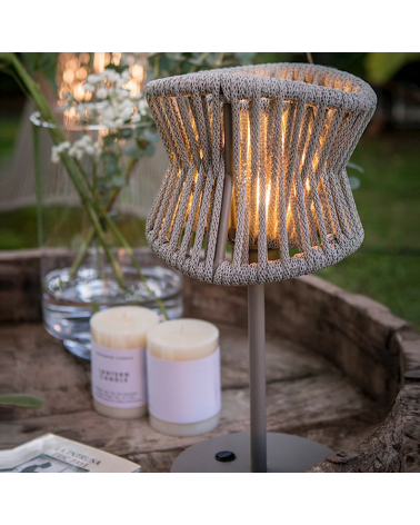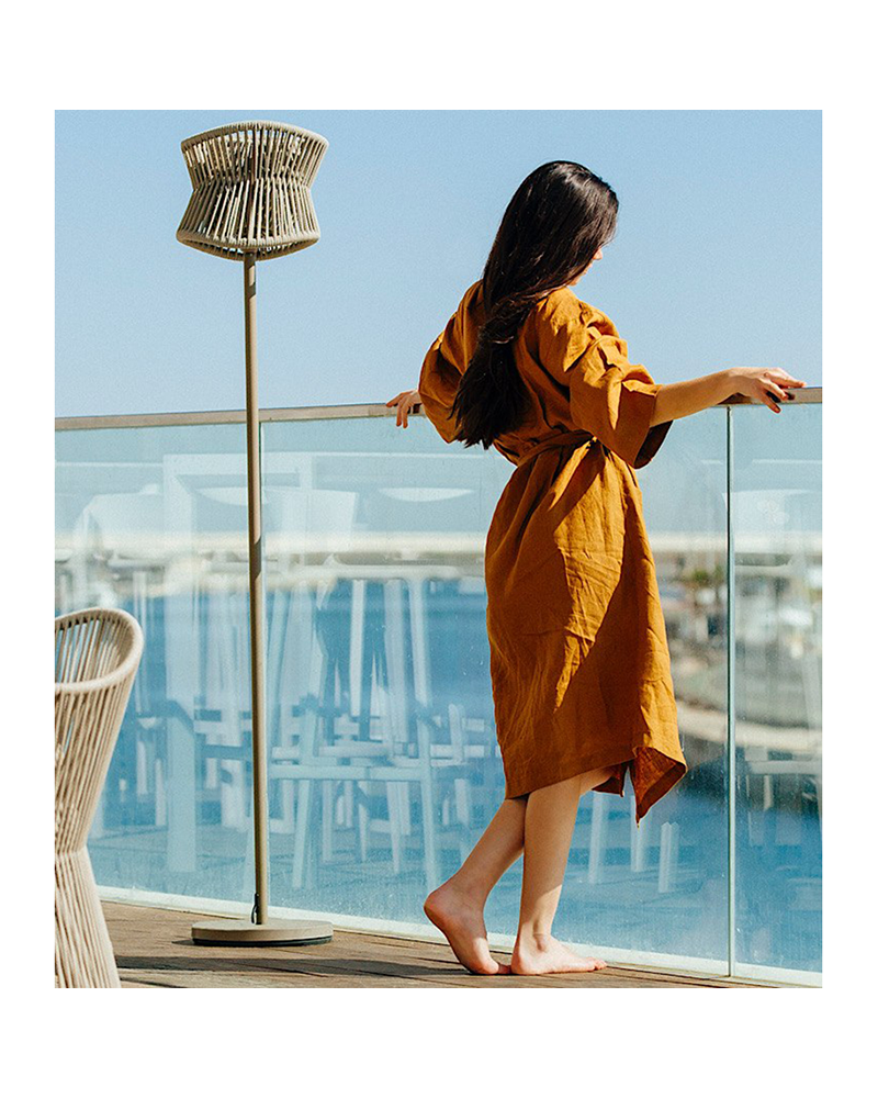 Original floor lamp suitable for outdoor use made of synthetic fiber finished in dark beige, 173cm high. E27 lamp holder. Bulb not included. IP44 protection. Perfect for decorating and lighting restaurants, terraces, porches, gardens, etc. Designed by Santiago Sevillano, a professional with experience in the lighting sector providing innovative solutions.