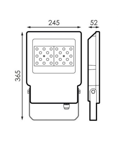 90W outdoor spotlight available in warm light 3000K and day light 5000K IP65. High luminosity and small dimensions. Aluminum body and transparent tempered glass diffuser. Color rendering index: >70. Class I. Duration of 30.000 hours.