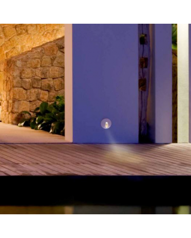 Recessed signal light designed for indoor and outdoor use with IP65 protection with 3W power, 3000K warm light. Made of aluminum and polycarbonate available in dark grey, black and sand white finishes with a round shape.
