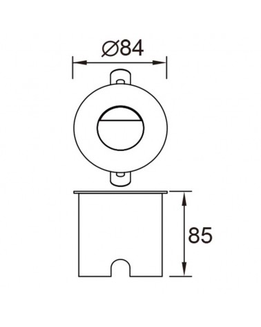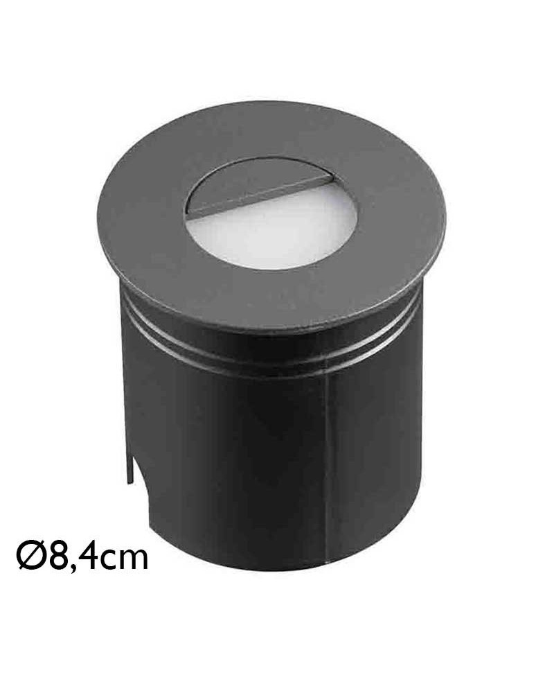 Recessed signage designed for indoor and outdoor use with IP65 protection with 3W power, 3000K warm light. Made of aluminum and polycarbonate available in dark gray, black and sand white finishes with a round shape.