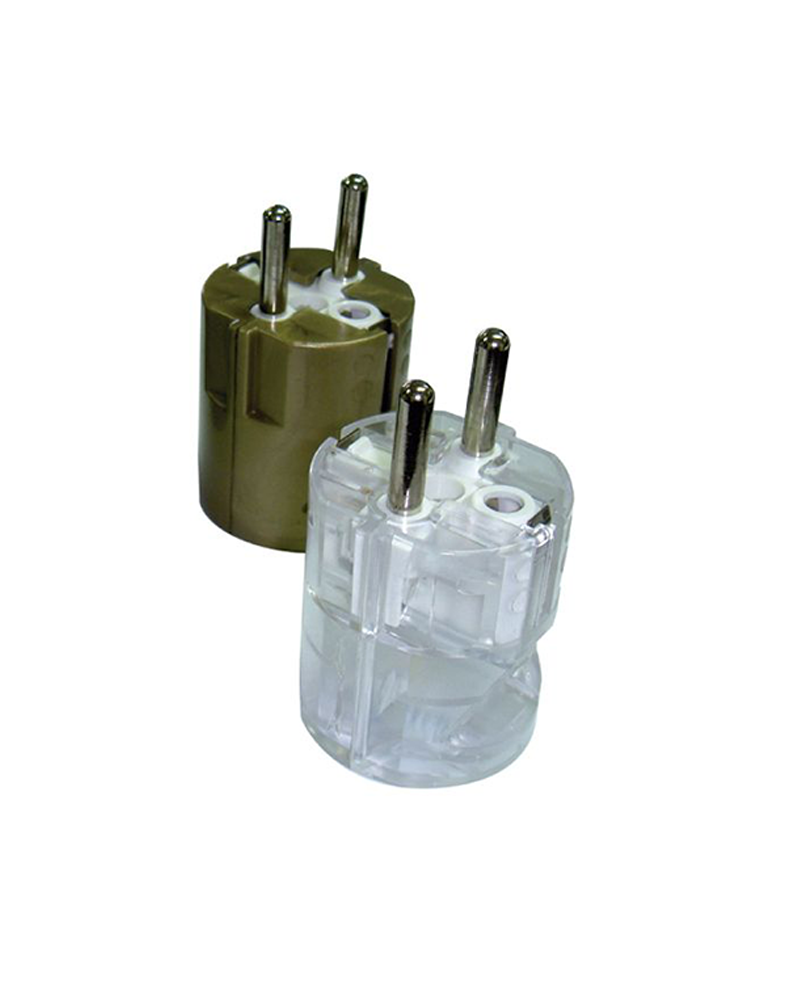 Schuko plug available in gold or transparent with a nominal current of 10 to 16A and a voltage of 250V.