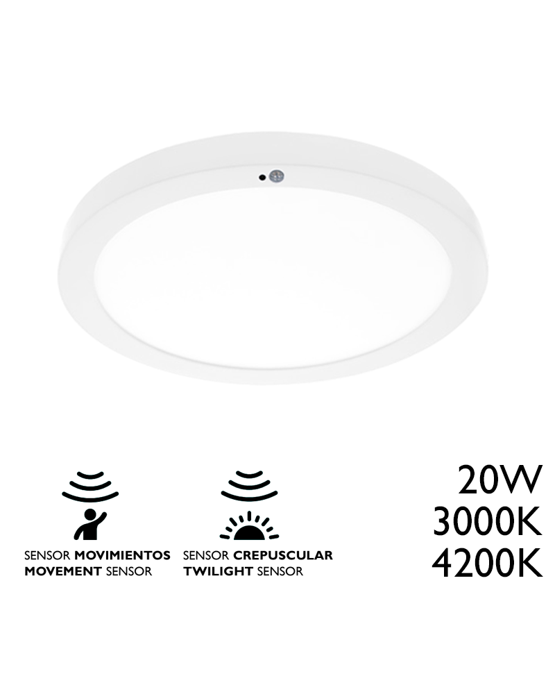 Downlight ceiling lamp with sensor 22cm surface round white finish LED 20W 3000ºK 1600Lm