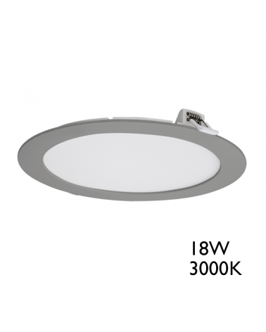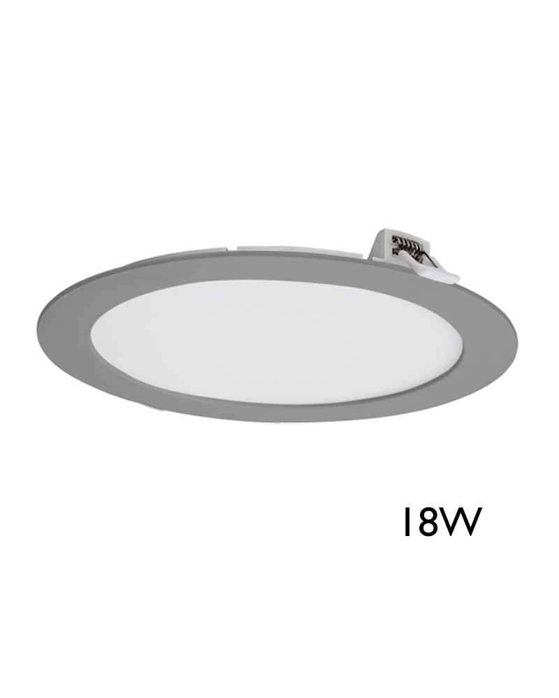 Recessed and extra-flat LED downlight of 18W with a diameter of 23cm, thickness 1cm., grey color. Very bright. Supports accessories (optional, sold separately): 1) Accessory for surface installation, 2) DALI regulation, 3) Bluetooth compatible. - Finish: grey RAL 9006. - Measurements: diameter 230mm, height 10mm. - Cutting hole: diameter 205mm. - Light angle 120º. Immediate ignition. - Material: polycarbonate body, opal polycarbonate diffuser. - Energy class: A+. Save on your electricity bill. - Long useful life (more than 25,000 hours).
