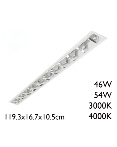 54W LED recessed screen measures 60x60cm. Available in 3000K, 5000K or 6500k, upon request. Steel material in white finish and aluminum reflector. It has a long life with more than 50,000 hours. Made with high quality materials designed in Spain. Bluetooth control available and adjustable by Dali system, on request.
