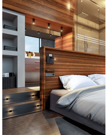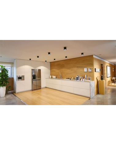 10 cm. in cylindrical format, 360º adjustable with 90º tilt, allowing the light to be focused and projected where desired. It can be placed on the wall or directly on the ceiling. Constructed of aluminum with gray, white and matte black colores.