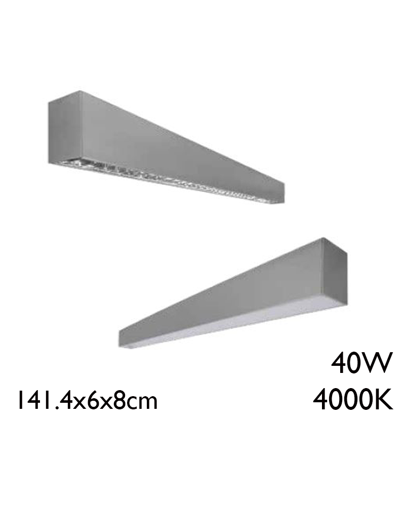 40W LED surface lamp 141,4x6x8cm. Made of aluminum, lighting system in Specular Al or PC Opal. Available in 3000K, 5000K or 6500K, upon request. High quality and long life with more than 50,000 hours. Available for surface, see surface kit reference 200-1T-460 or for suspension, see suspension kit reference 200-1T-461, with two possibilities: 3x0.75mm2 supply reference 200-1T-769 or 5x0.75mm2 supply reference 200-1T -770. Made with high quality materials designed in Spain. Bluetooth control available and adjustable by Dali system, on request.