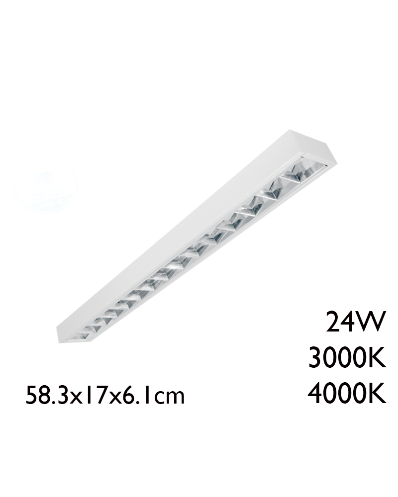 24W LED surface lamp. Measures 58.3x 17x6.1cm. Available in 3000K or 4000K, and on request in 5000K and 6500K. Steel material finished in white. It has a long life with more than 50,000 hours. Made with high quality materials designed in Spain. Bluetooth control available and adjustable by Dali system, on request.
