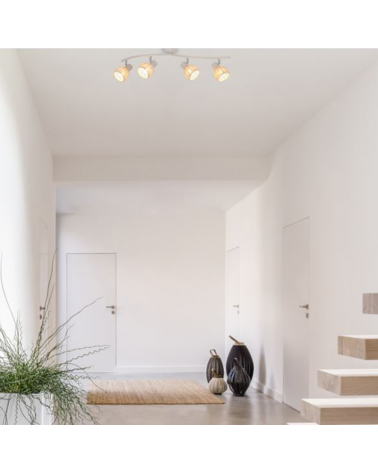 4 boho style spotlight strip made of white finished metal combined with 4 hand-woven natural rattan ball-shaped lampshades. Adjustable so you can choose the direction of lighting. Made with ecological materials and without impact on the environment.
