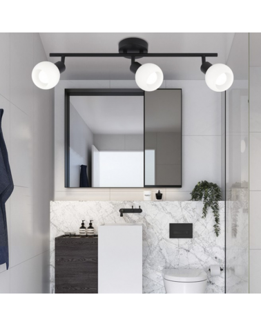 3-spot strip made of metal with White frosted glass screen, simple and versatile design ideal for bathrooms and kitchens. Available in satin nickel, brass or black finishes. Labeled luminaire, the spotlights can be adjusted in position.