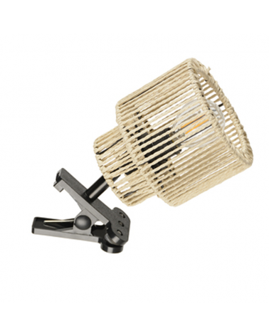 Articulated spotlight with clamp made by braided paper cord creating an original lighting, handmade natural finish creating a boho style. Plastic clamp which allows its placement on furniture or other objects, taking the light where you want. Robust clip keeps the luminaire firmly in place and at the same time does not damage the material to which it is fixed. Made with ecological materials and without impact on the environment. Bulb not included.