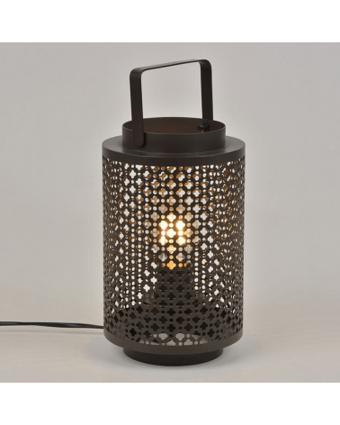 Very decorative and original table lamp 31.5cm high made of metal with a black die-cut finish in the Masharabiya style. It has a handle to be able to transport it more easily. Perfect for side tables or nightstands.