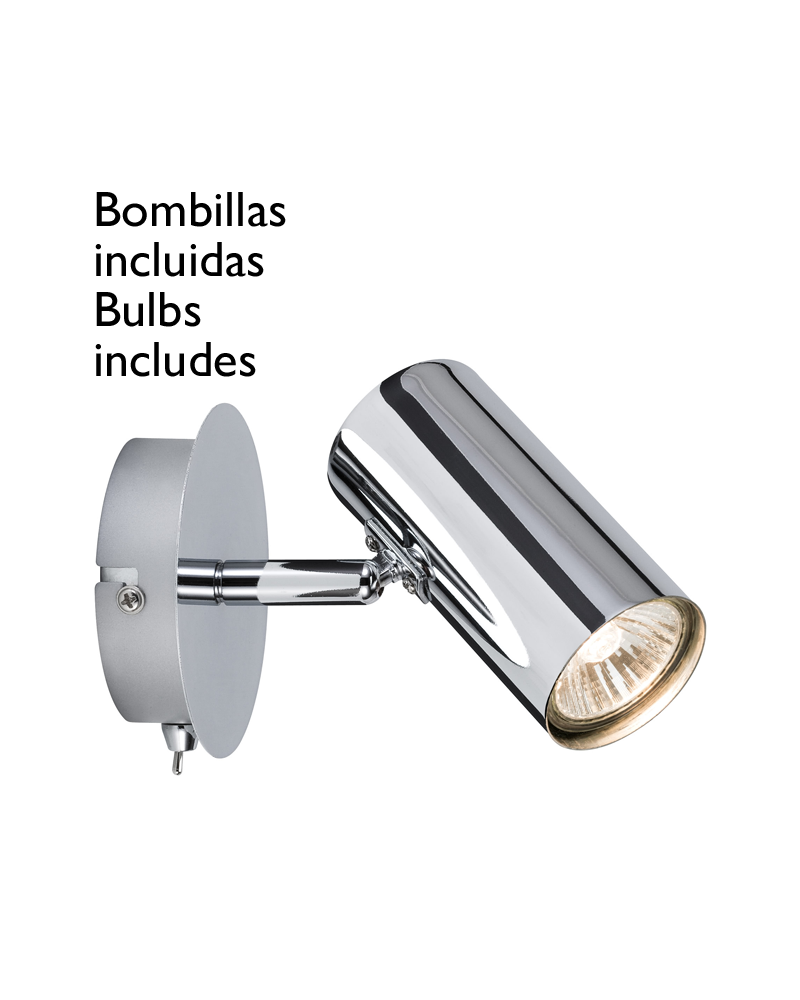 Wall lamp in a modern style with a chrome finish and a switch. Includes dichroic halogen bulb (incl. 1×40 W, GU10, 300 lm, 2900 K 5 30°, 900 cd). 160º adjustable spotlight