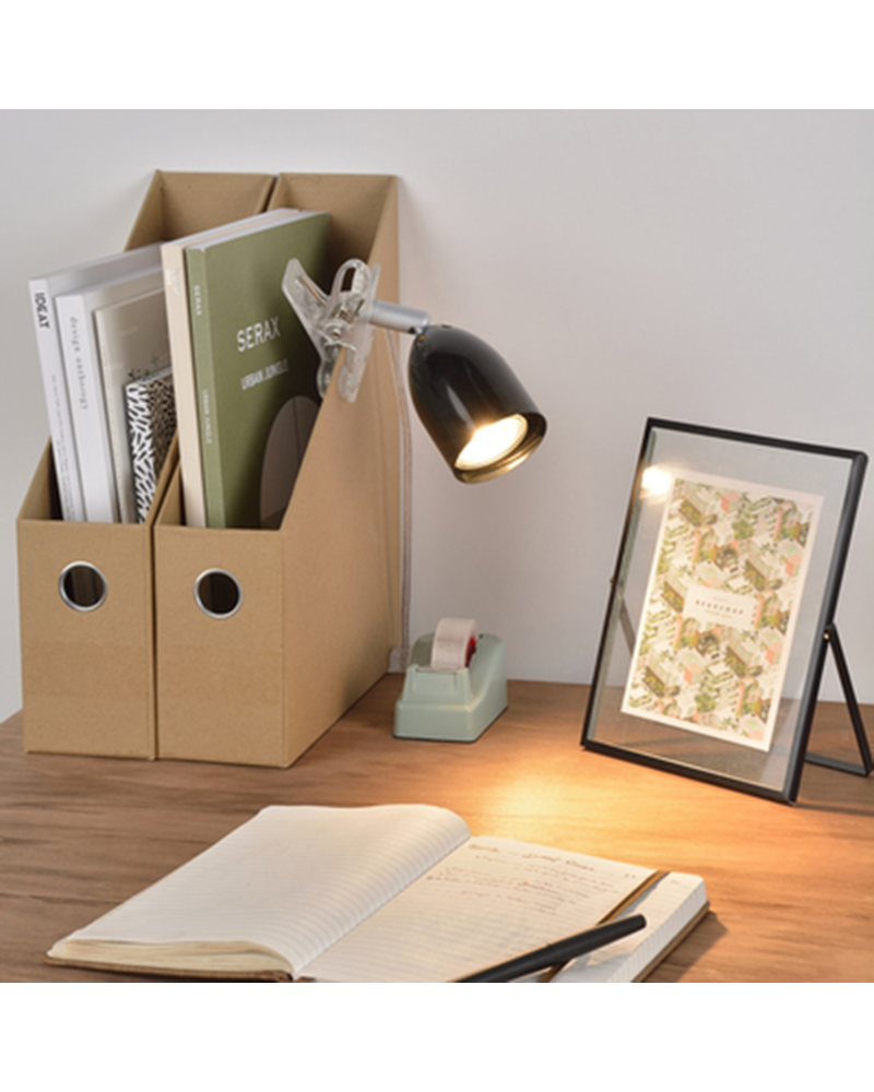 Foco articulado con pinza con una pantalla de metal disponible en acabado negro y blanco. Abrazadera de plástico la cual permite su colocación en muebles u otros objetos, llevando la luz a donde tú quieras. Pinza robusta mantiene la luminaria firmemente en su lugar y a la vez no daña el material al que está fijada. Con interruptor facilitando el encendido y el apagado.