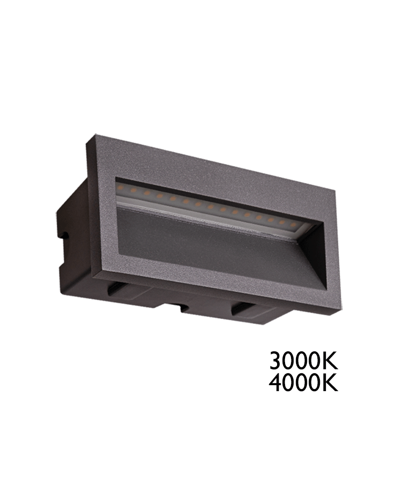 Aplique rectangular empotrable LED 3W disponible en 3000K o 4000K IP54 apto para exteriores 80º . Acabado: gris oscuro, RAL 7010. Fabricado en España