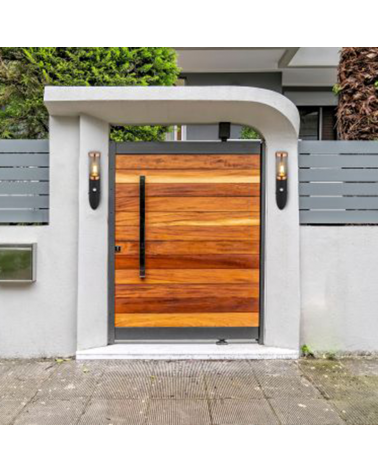 Acabado en negro y detalles en cobre. Cuenta con un casquillo E27 que permite una potencia máxima de 15W, asegurando un consumo energético reducido y una larga vida útil. Esta luminaria también cuenta con un sensor de movimiento que cubre una distancia de hasta 8 metros, lo que significa que la luz se encenderá automáticamente al detectar la presencia de personas.
